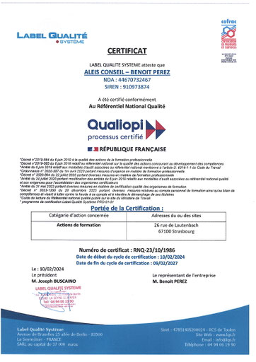 Si malgré tout le soin apporté à nos formations vous auriez des plaintes ou des réclamations à nous faire remonter, nous vous prions de trouver un formulaire à renseigner et à renvoyer à aleisconseil@aleisconseil.fr
